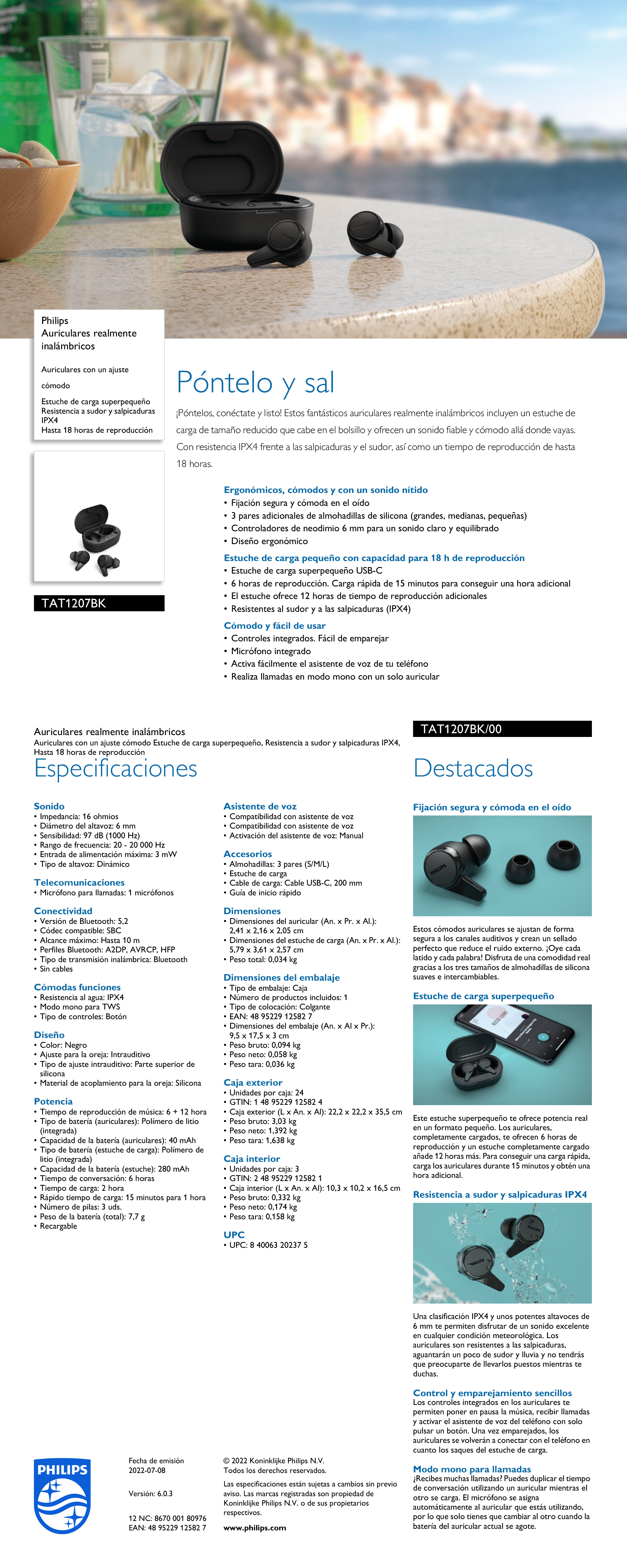 • Philips Audífono True Wireless Bluetooth TAT1207 Negro