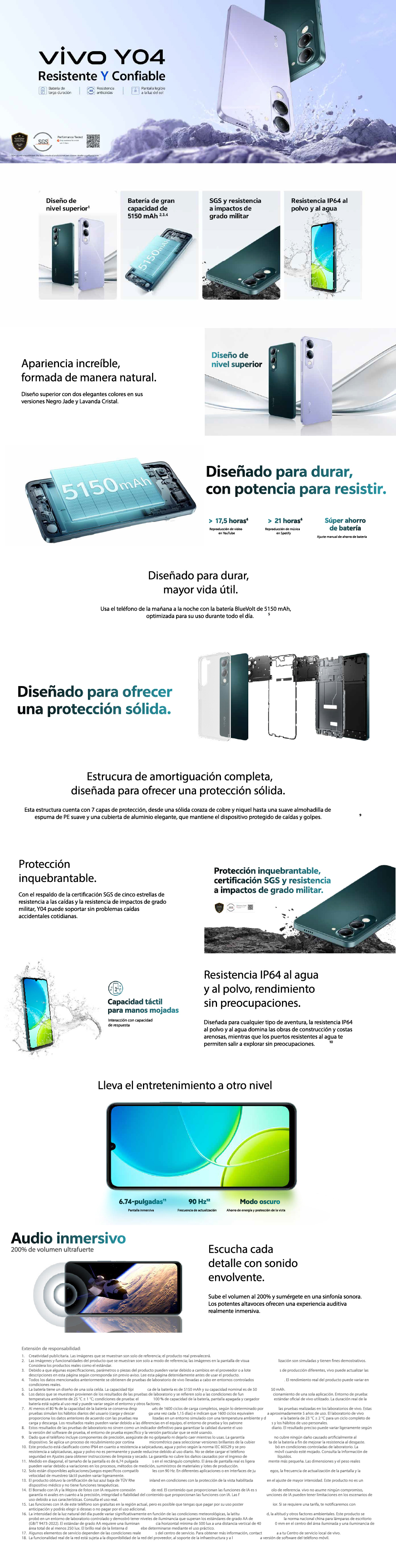 El Vivo Y04 ofrece confiabilidad y autonomía con procesador Unisoc UMS9230H octa-core, pantalla LCD de 6.74" HD+ con 90 Hz y brillo de hasta 570 nits, y una batería de 5150 mAh. Cuenta con cámara dual trasera de 13MP con IA para modos Noche y Retrato, cámara frontal de 5MP, almacenamiento de 128GB, certificación IP64 contra polvo y salpicaduras, y sistema operativo Android 14, ideal para tareas cotidianas y redes sociales.